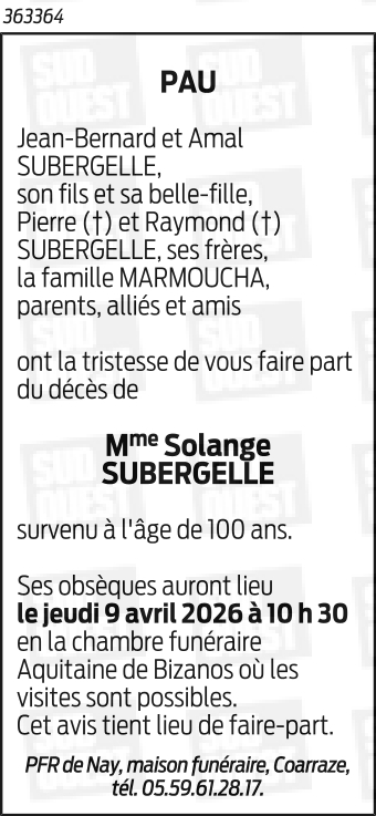 C’est avec une grande tristesse que nous vous annonçons le décès de Solange SUBERGELLE survenu le samedi 04 avril 2026 à Pau. La cérémonie se déroulera le jeudi 09 avril 2026 à 10h30 à l’adresse suivante : Chambre Funéraire Aquitaine - 22-24 Avenue du Corps Franc Pommiès - 64320 Bizanos.